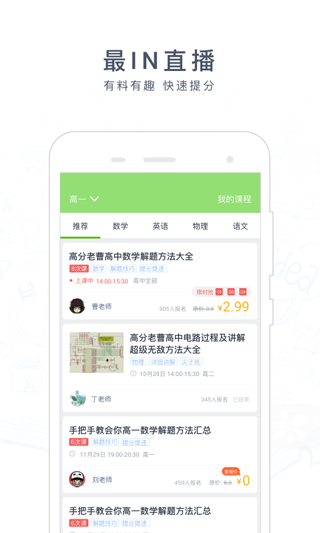 3、最IN直播:随时随地听课刷题,金牌名师,有料有趣 ,互动教学,快速提分!