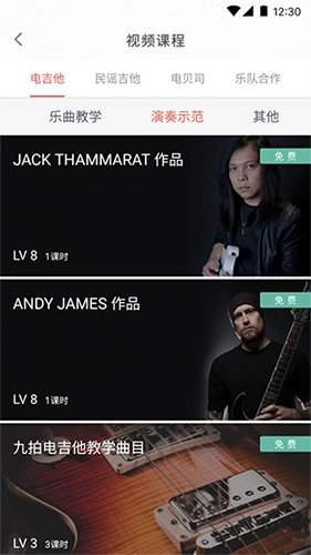 畅弹吉他app中包含大量的国外大师曲目分段进阶学习视频及大量的技术讲解和技术分享等视频课程,可以对学生和乐手参加日常学习、考级考学、演出比赛等活动进行高效辅导。