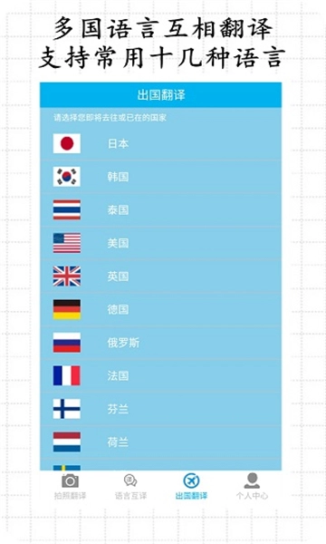 翻译语种:支持英语、日语、韩语、法语、俄语、西班牙语等一百多种语言翻译,覆盖一百多个国家,英语翻译、出国翻译、旅行翻译、旅游购物都不用担心。