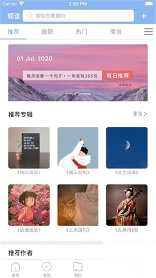 3、打开软件的首页就会给用户进行智能推荐的功能,帮助用户可以快速的拥有更多的唯美的语句。