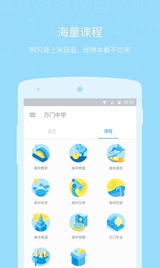 万门中学是一款专为万门中学开发的学习软件用户在本款软件上可以进行课程辅导,都是以视频形式的播放教学讲解德 ,都是通过视频的形式教学,学生们可以针对自己薄弱的学科进行学习,软件还有各种名师在线辅导,此外,课程均为原创,目前已涵盖大学、高中、语言、职场等各类课程。