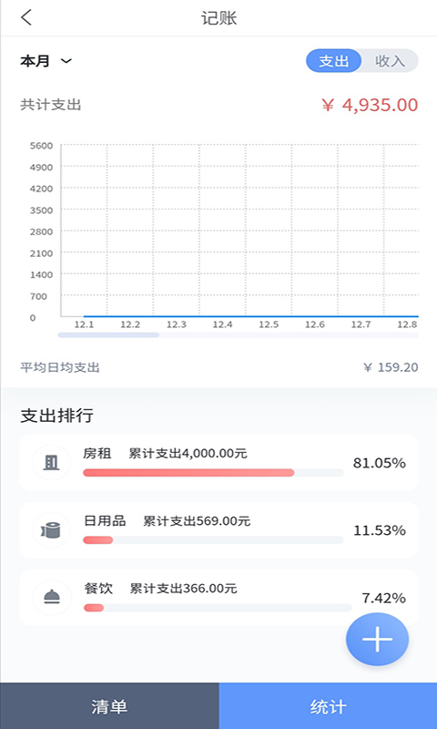 3、图表统计:记录您支出和收入的总数据、消费分类以及消费心情。
