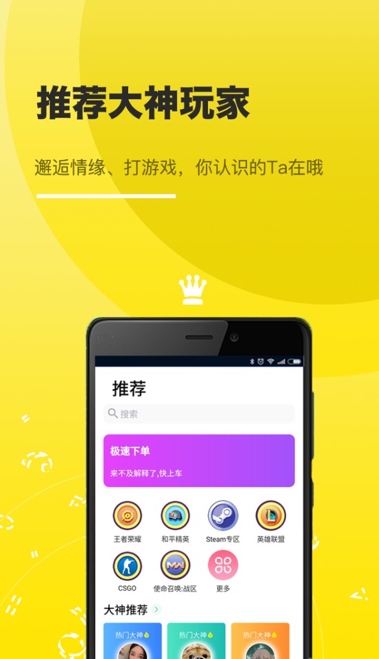 2、专业技术大神,满足游戏服务需求,极速下单功能,申请大神,推荐等,还能走心匹配,自由恋爱。