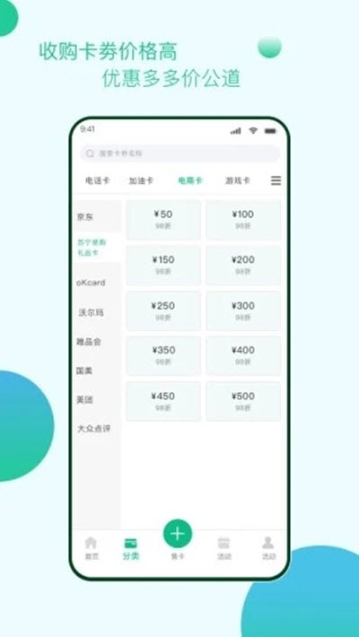 1、支持多种不同的卡券回收,还能够一站式的进行收购等;