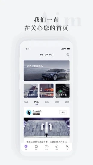 高合HiPhi,为用户提供汽车手机智能互联系统。车主可以通过手机app即可远程操控汽车,实时掌握汽车动态信息,了解汽车当前电量及行程里程数,避免汽车电量不够发生意外等。同时也是汽车资讯整合发布平台,车主及粉丝可以随时随地查看高合汽车的全面的资讯,掌握最新新车发布消息,快人一手。