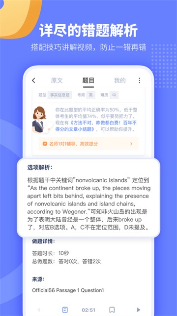 2、明细的错题记录反馈功能,统计每个题型题材的错误率,帮您了解自己的薄弱点,错题可分类重练,各个击破。