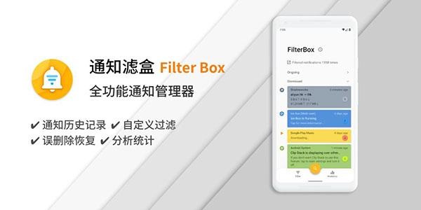 通知滤盒(Filter Box)可以有效的拦截恶意的通知就能屏蔽掉各种垃圾广告通知,可以自己设置哪些软件的消息在通知栏上可以显示,让我们不被垃圾短信干扰,不重要的通知免打扰,需要的小伙伴们欢迎来体验。