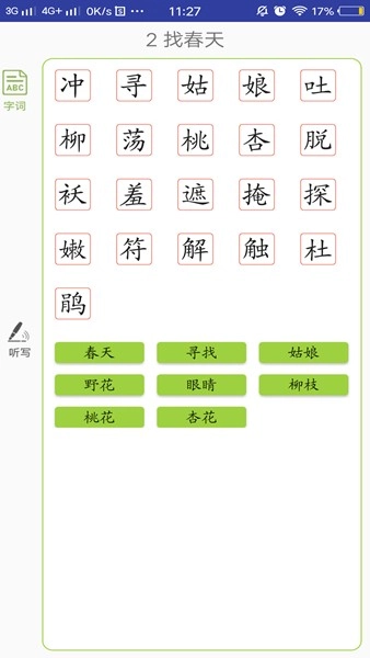4、提供了听写练习,根据提供的读音,选择正确的字词;