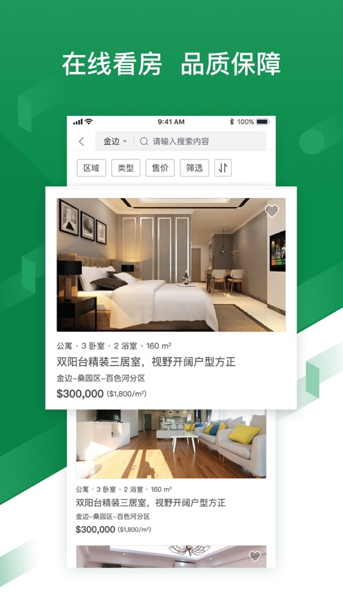 您可以通过APP在线看房,足不出户轻松了解各个房源信息。可按区域找您需要的楼盘、住宅、商用房产、土地,热门区域全面覆盖,智能为您精准找房,帮您做最合理的买房决策。