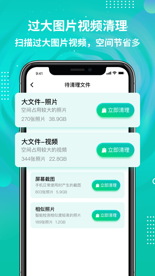 3、过大图片视频清理:扫描过大图片视频,空间节省多,操作便捷,效率极高!
