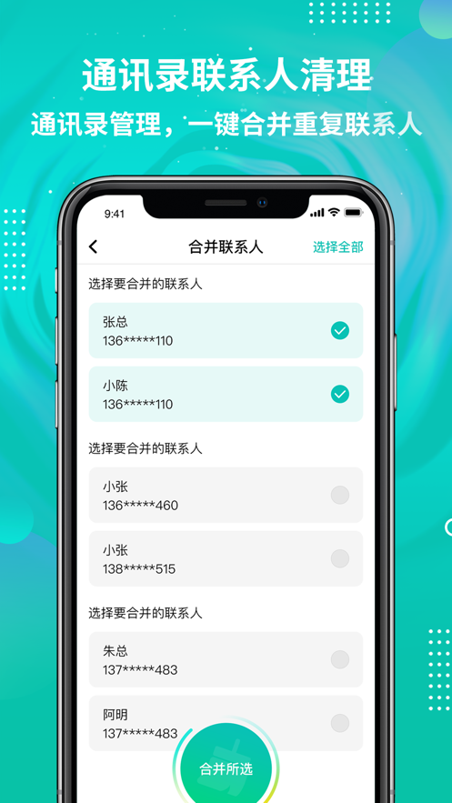 1、通讯录联系人清理:通讯录管理,一键合并重复联系人,免除重复无效等烦恼!