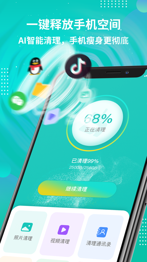 手机空间的一键释放,AI智能清洁,手机纤薄到位,不再受内存不足,卡死等问题困扰。