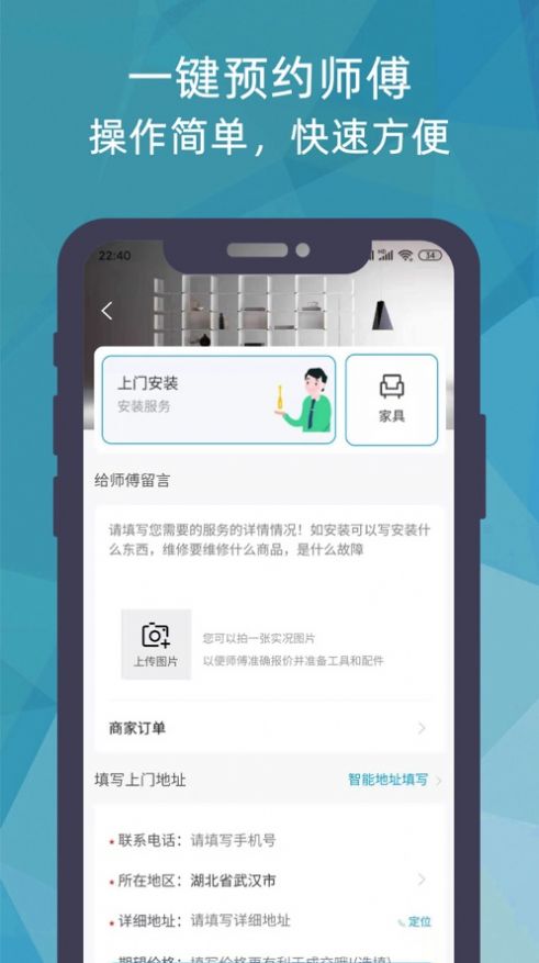 3.平台上预约专业师傅,近期下单快速的体验到,上门服务1对1进行了解,还有各种保险保障。