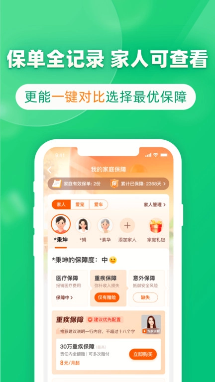 3、管理全家的保单,为每位家人补充多方位额度保障。