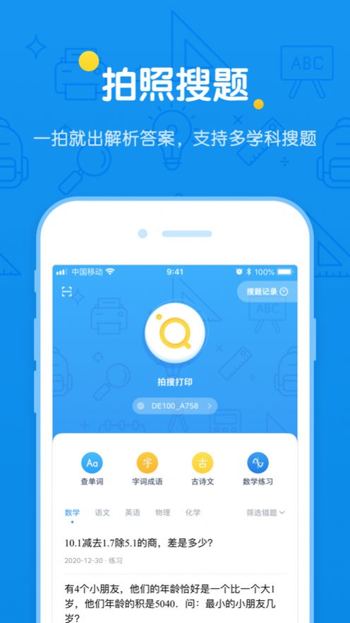 1.拍搜打印:拍一下题目即可搜出解析和答案,打印出来随时复习支持多学科拍搜;