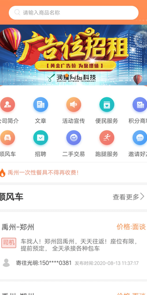 2、用户可以在钧禹中州app平台免费发布招聘、房屋租赁、商品转让、顺风车、等信息。