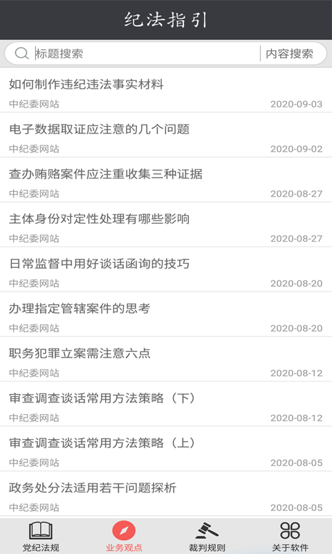 纪法指引APP收录190多个纪法文书,880多个业务观点以及210多个裁判规则,让用户能够在手机移动端快速查找所需要的纪法文书,