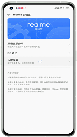 2、在进入realme实验室后,用户可以找到并点击入眠胶囊选项,进入设置界面。