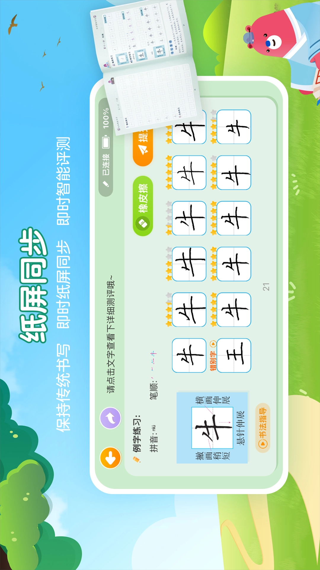 2、智能识别:利用先进的AI技术,实时检测和纠正书写错误,并进行了准确的指导;