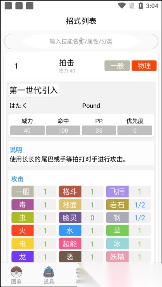 1. 百科界面设计精简美观,用户可便捷地通过输入宝可梦名字或编号,查找对应的宝可梦。