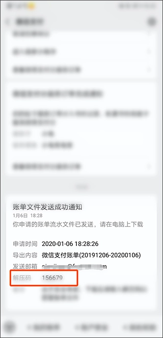 10、微信导出的文件,是带有解压密码的zip压缩包,因此,导出成功后,微信会收到 \\"微信支付\\" 的通知,通知消息会显示解压密码,如下图所示: