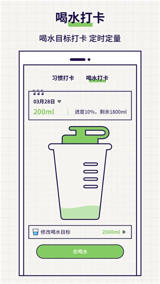 3、喝水打卡:通过设置喝水提醒功能,帮助用户每日摄入充足水分,维持身体健康。