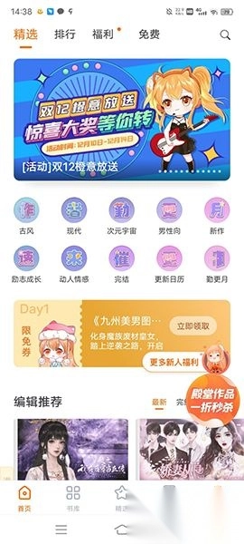 作为App的门面,首页使用十分简洁的布局为用户提供实用的多项功能,如编辑推荐、活动指南等,且新人用户注册还可领取殿堂作品一折秒杀的福利,什么值得推荐。