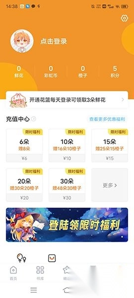 用户可在此充值花篮以及签到免费领取限时福利,除此之外用户所登录账号的积分、彩虹币等信息可这里查阅。