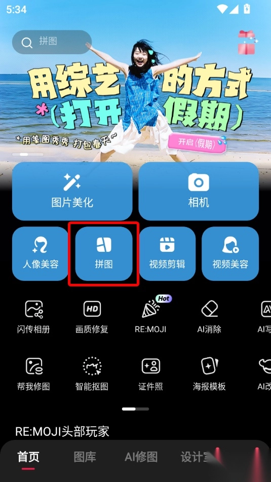 1、打开美图秀秀后,在首页点击拼图功能