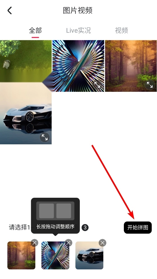 2. 点击图片来进行选择,也能够在下方列表中长按图片,通过拖动的方式调整顺序,完成上述操作后,点击“开始拼图”。