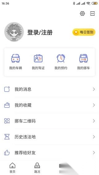 5、点击我的,可以登录,每日签到,绑定车辆核驾驶证等