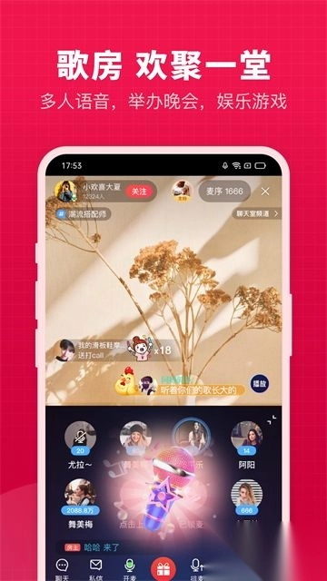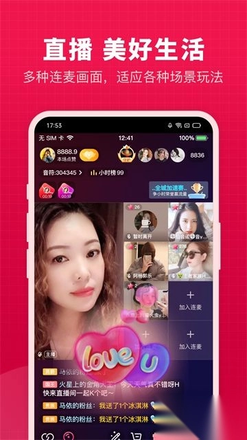 2. 提供视频直播与语音直播形式,支持多人同时连麦展开互动,互动环节丰富多样。