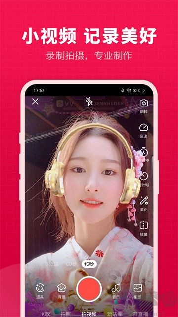 5. 快速进行短视频的拍摄与剪辑,拥有自带的滤镜、道具及模板,能轻松发布短视频。
