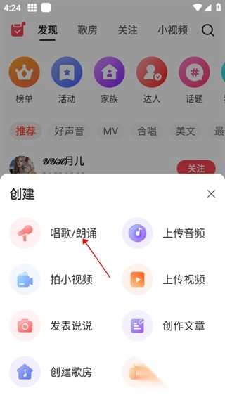 1. 打开主页,轻点下方的加号图标,随后点击“歌唱朗诵”选项。