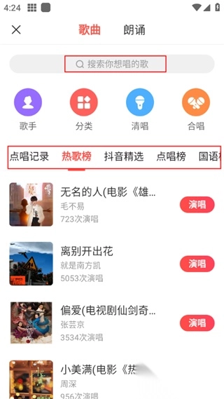 2.搜索你想表演的曲目,或者在下方分类里直接查找;