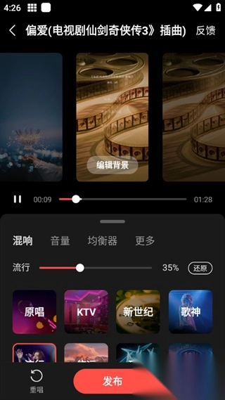 2. 对音效、歌词显示进行调节,使演唱视频效果得到优化。