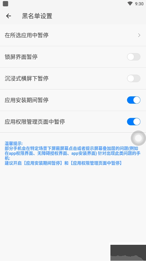 一旦应用被加入黑名单,边缘手势、悬浮球以及顶部手势操作将会自动被禁用,以此保障使用的纯净度。