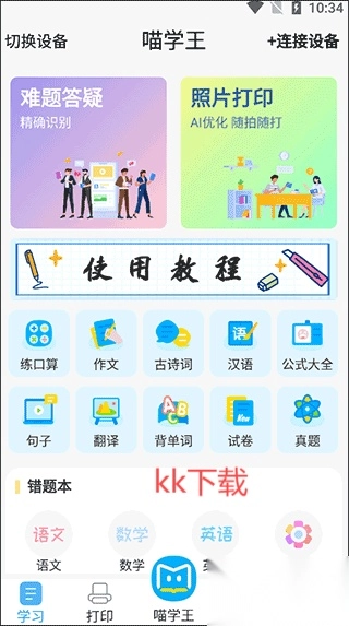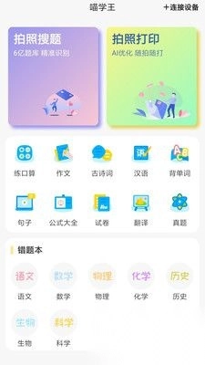 1、第一步,请打开软件。在首页界面,既可以点击右上角的“+连接设备”选项;也能够直接点击“喵学王”,从而进入选择打印机的界面。