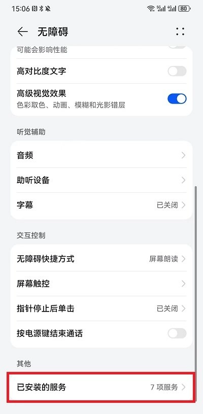 3、由于软件要用到手机的无障碍功能,因此点击OK后,便会跳转至无障碍功能界面,在此界面找到最下方的【已安装服务】。