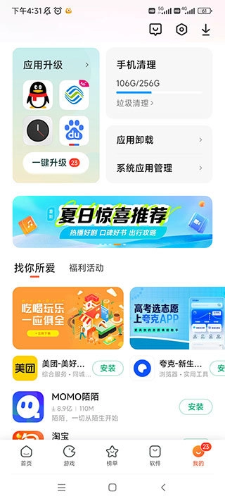 1. 打开在本站安装完毕的软件,进入“我的”界面。在此界面,您能看到应用升级、应用卸载、手机清理以及系统应用管理等各类实用功能。