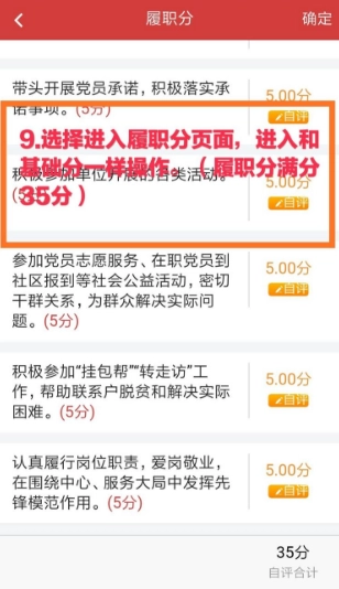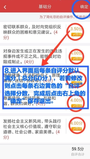 8、系统默认每条均为满分,黄色框框内的自评可对分数进行修改。逐条修改完成后,点击右上角的“确定”即可保存。