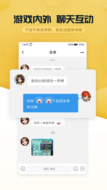随时随地与游戏好友和帮派聊天,每时每刻关注帮派情况,感受移动IM的便利!