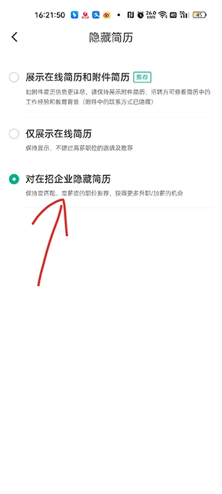 2、进入设置后往下滑动,找到隐藏简历的选项,点击进入;