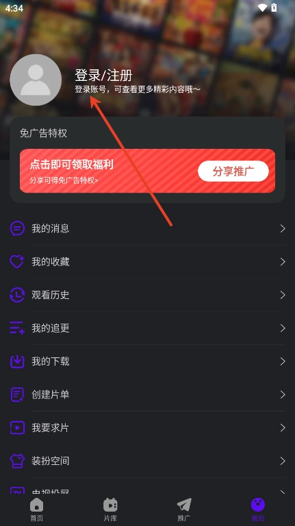 3、于个人主页处,用户点击登录注册便可。
