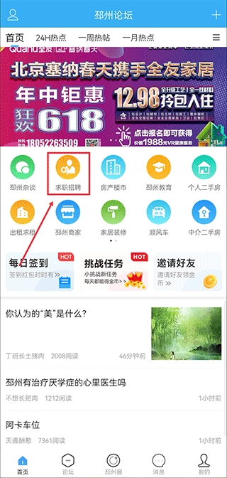 1、打开邳州论坛,在首页中点击求职招聘