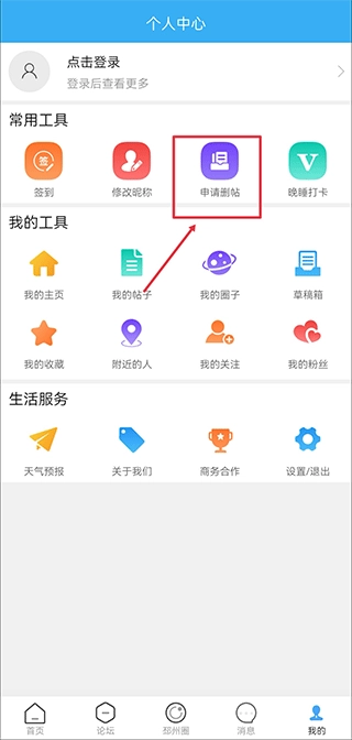 1、在我的界面中,点击申请删帖