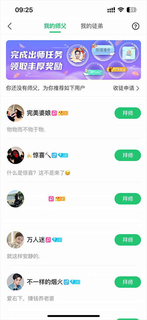 2、在此页面,你可以挑选一个自己心仪的,然后点击右边的“拜师”按钮。