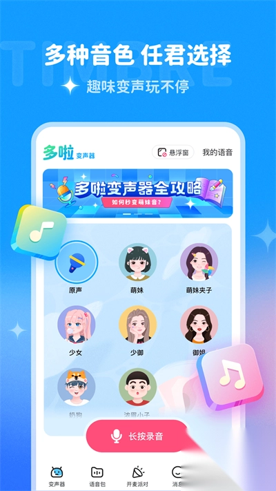 1、多啦变声器app拥有多种音色效果,包括男变女、女变男、幼儿音、老人音等,各种语音包都能免费使用;