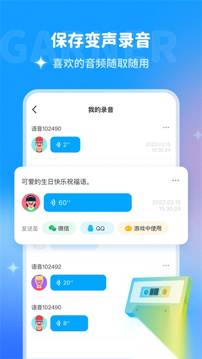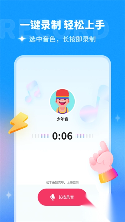 —键录制,轻松上手,选中音色,长按即录制男声女声随心转化趣味变声玩不停。