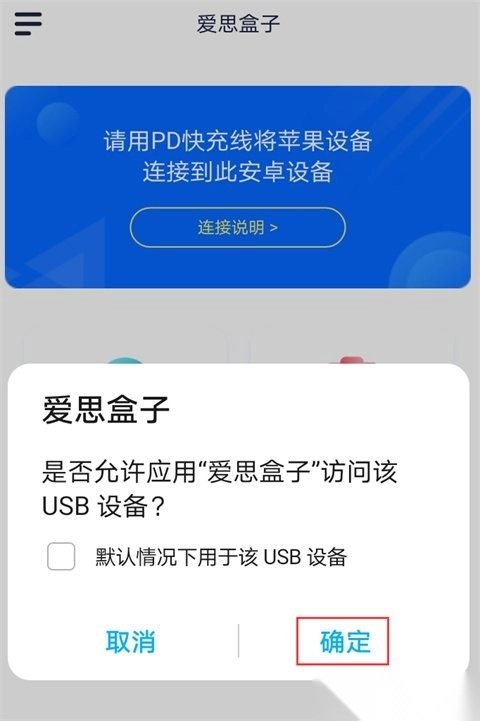 安卓手机连接数据线后,屏幕会弹出“是否允许‘爱思盒子’访问该USB设备”的提示,这时请点击“确定”以授予USB访问权限。